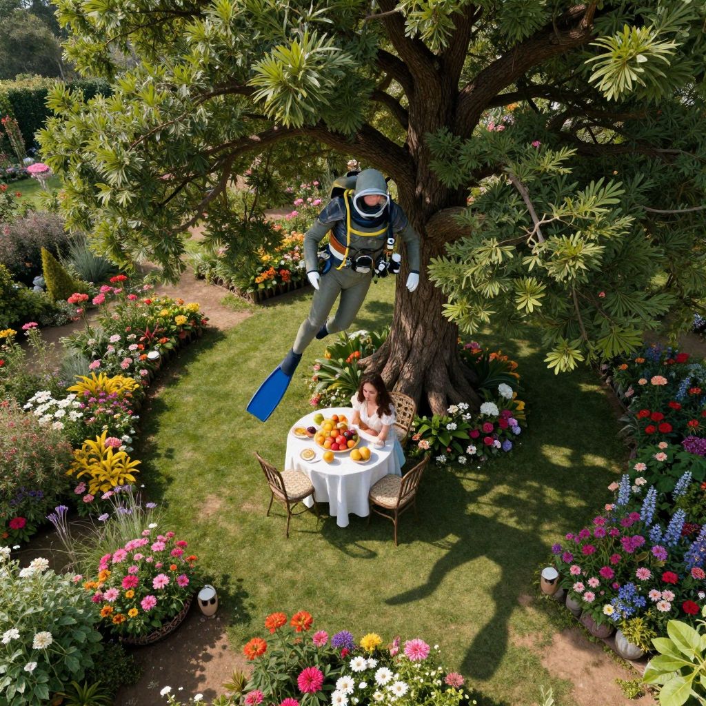 Photograph of a vibrant garden with a lush green lawn and colorful flower beds surrounding a large tree. A scuba diver with a blue flippers and snorkel gear is suspended upside-down in the tree's branches, looking down at a couple sitting at a white-clothed table. The couple is enjoying a meal with a colorful fruit arrangement. The diver's yellow and black wetsuit contrasts with the greenery. The scene is bathed in bright sunlight, casting shadows on the grass. The garden is filled with various blooming flowers in red, pink, yellow, and white hues.