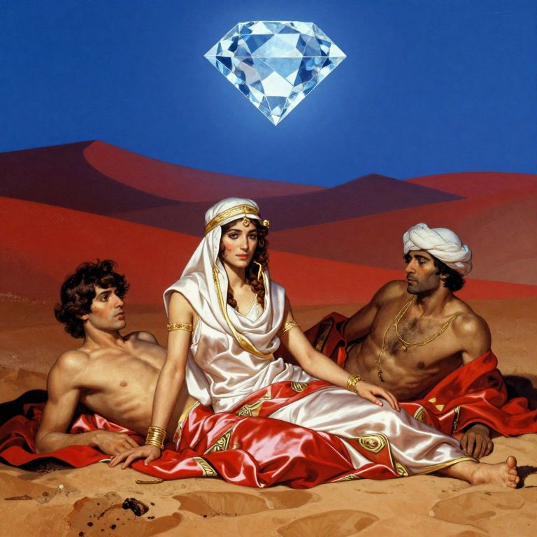 Silk sheet desert ecstasy bedouin under crimson azure diamond sky, in the style of frank frazetta, jeff easley, caravaggio, extremely clear faces coherent, clear lines, 8k revolution
