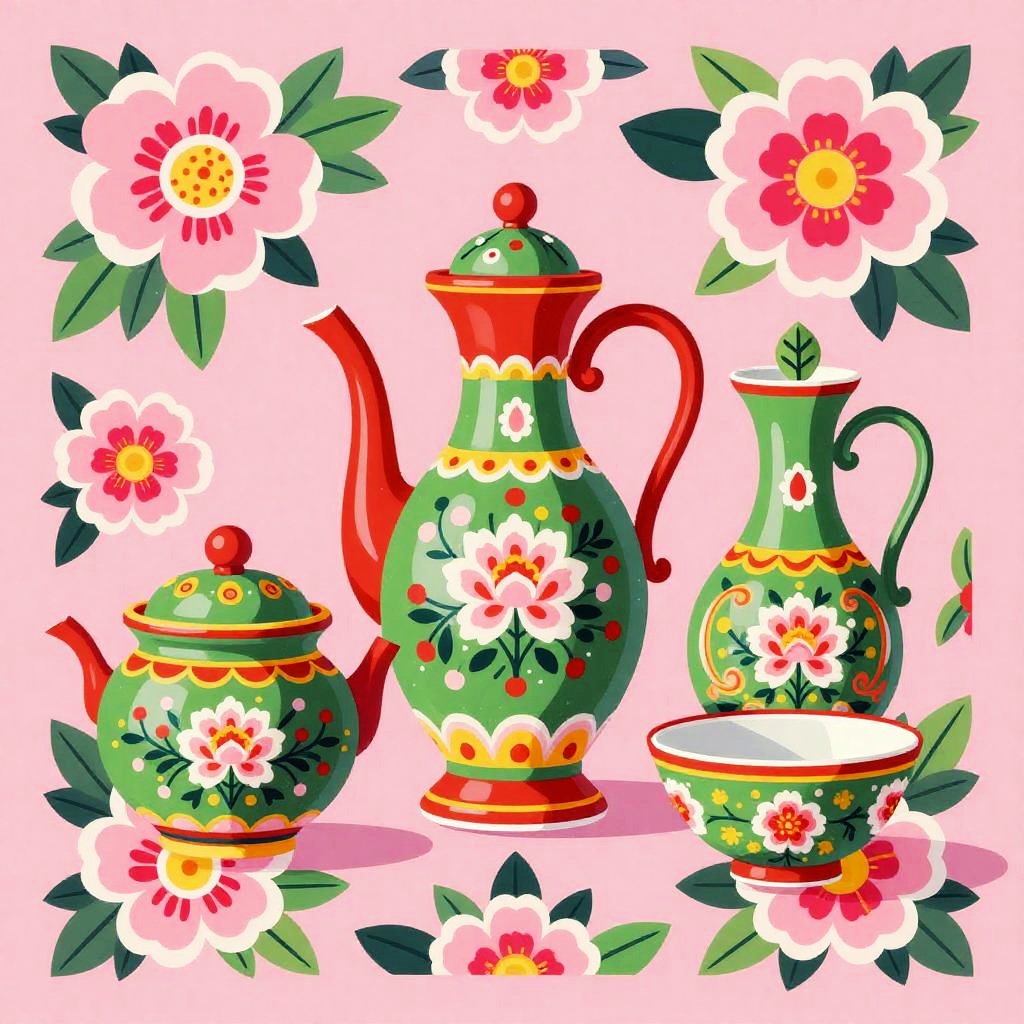 This vibrant digital illustration features a set of colorful, decorative ceramics against a bold, floral-patterned background. The green and red pottery includes a large teapot with a handle, a matching smaller pot, a decorative jug with a leafy top, and a bowl, all adorned with intricate floral designs. The background is lively with large, pink and green flowers, and the entire piece is framed in a pink border with additional floral accents at the bottom.