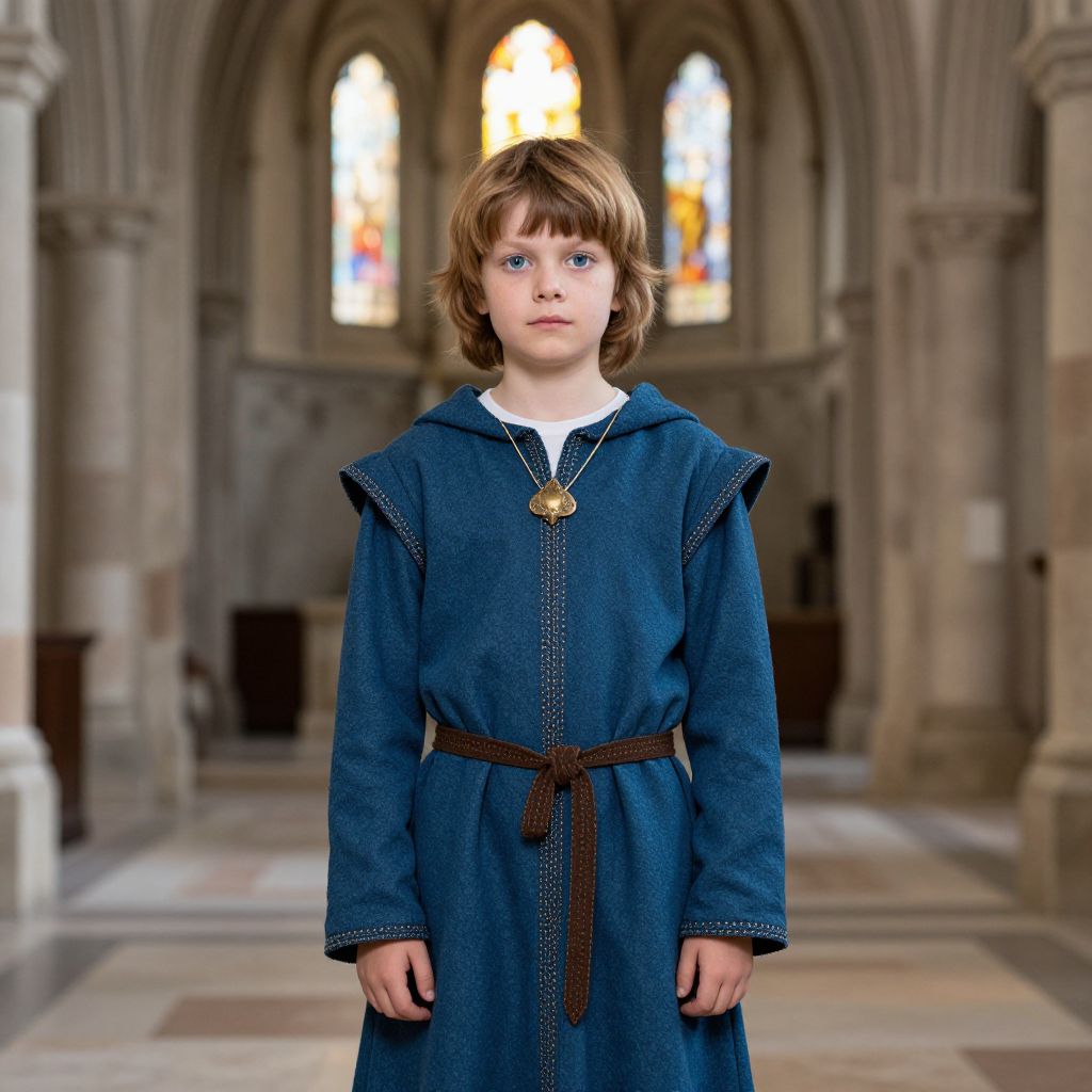 Photograph of a young boy with blue eyes, wearing a blue medieval-style tunic with brown belt, standing in a Gothic cathedral with stained glass windows