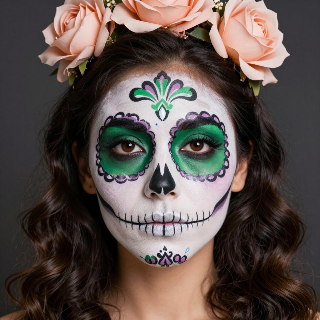 Woman showcasing intricate Día de los Muertos sugar skull makeup art, featuring bold green and black designs around her eyes, a symmetrical floral pattern above her forehead, and a delicate rose crown adorning her dark, wavy hair.