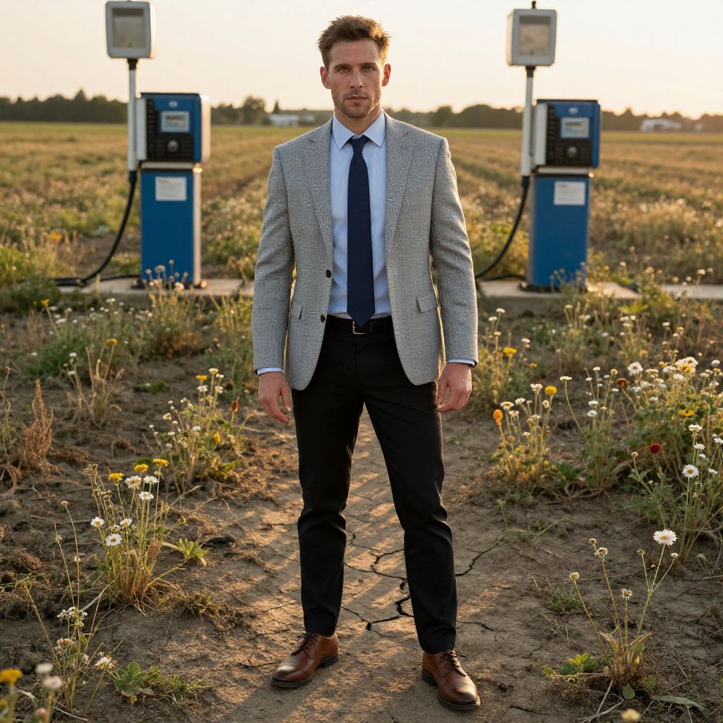 Photograph of a Caucasian man with short, dark brown hair and light stubble, standing in an open field during sunset. He wears a light gray checkered blazer, white dress shirt, dark blue tie, black dress pants, and brown leather shoes. Two blue and gray fuel pumps are positioned behind him, slightly to the left and right, with yellow wildflowers and grasses scattered across the dry, rocky soil. The background features a distant, tree-lined horizon under a clear sky. The man's expression is neutral, and he stands with his hands by his sides, centered in the frame.