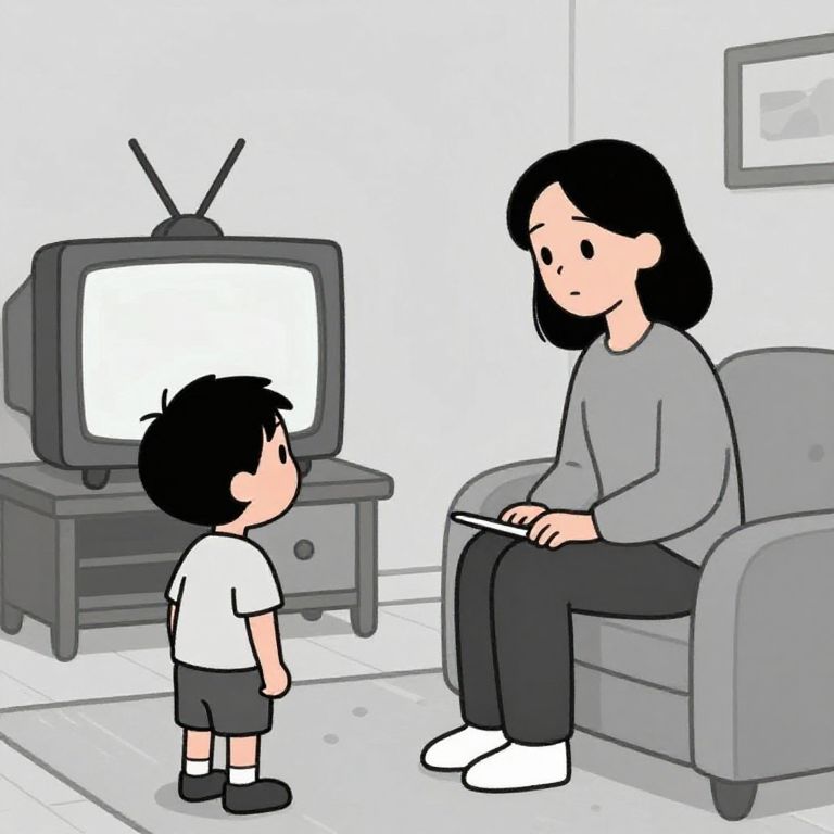 This digital drawing depicts a simple, cartoon-style scene in a minimalist living room. A black-haired woman with pale skin, wearing a gray long-sleeve shirt and black pants, sits on a gray couch holding a white tablet. She has a neutral expression and is looking at a young boy with black hair and pale skin, who is wearing a white t-shirt, black shorts, and black shoes. The boy stands facing her with a curious expression. Behind them is an old-fashioned TV with antenna sticks on top, placed on a dark wooden stand with two drawers. The background features a plain white wall with a small framed picture. The floor is white-tiled. The overall style is clean and simple with flat colors and minimal shading.