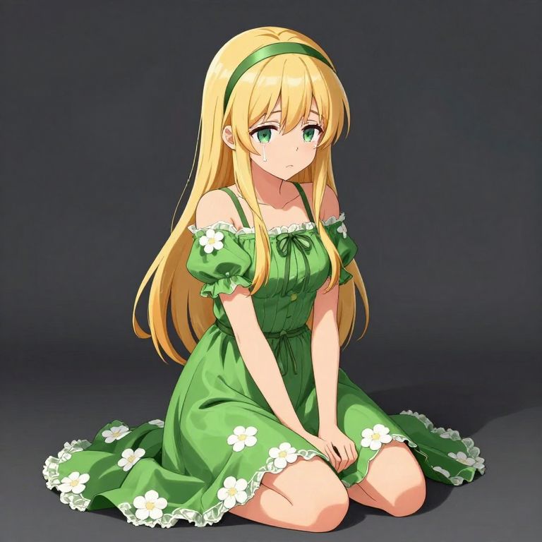 A beautifully detailed anime illustration of a blonde girl in a green dress, sitting on the ground with a sad expression, tears streaming down her face, against a dark gray background.