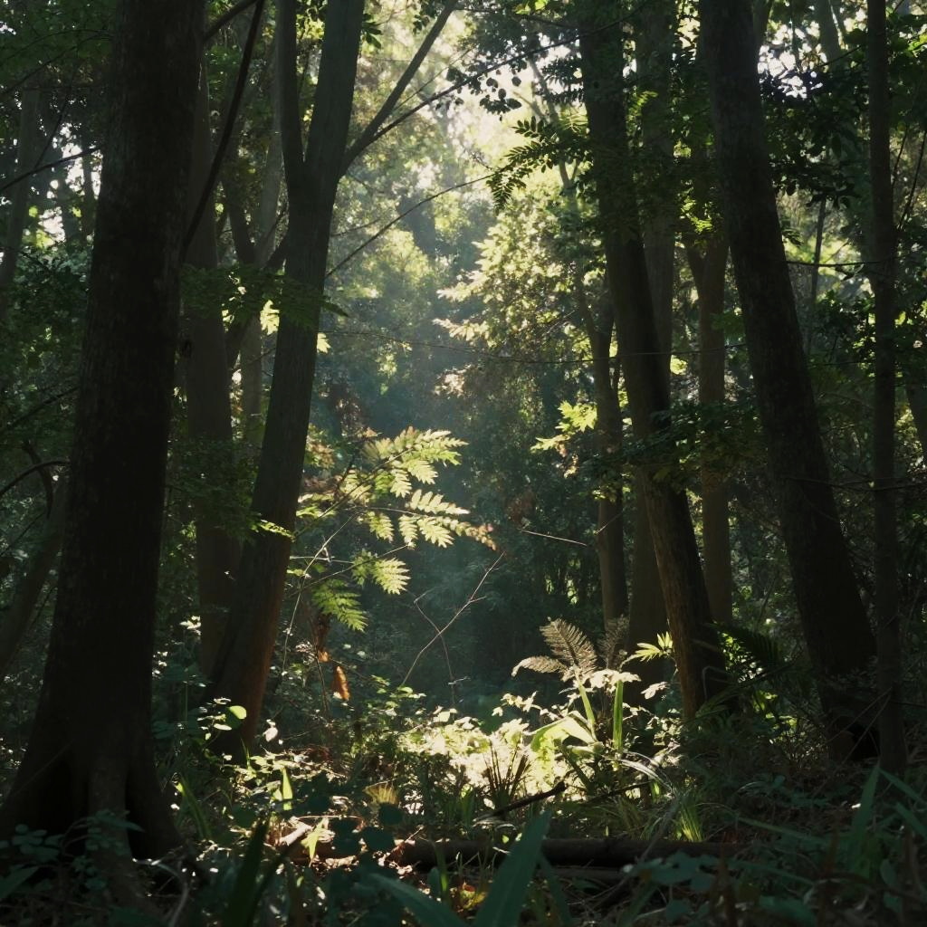 Photograph of a dense forest with tall, dark trees, sunlight filtering through leaves creating dappled light and shadows on the forest floor.