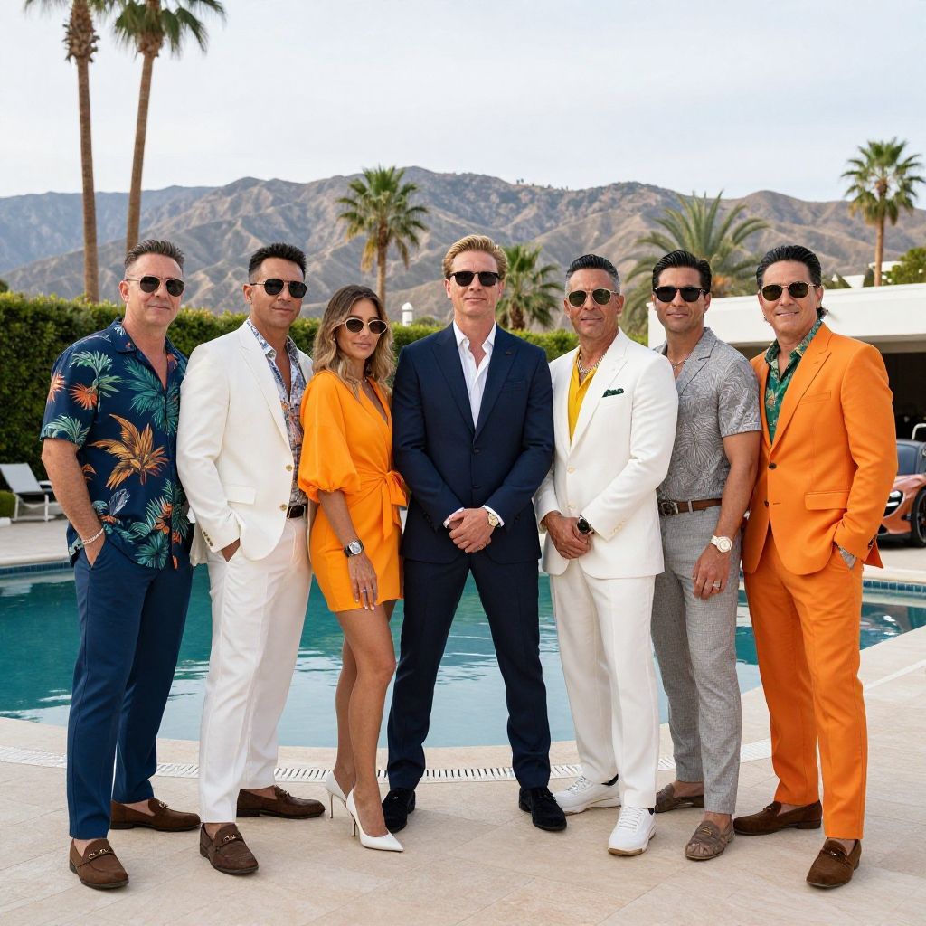 Group of seven well-dressed, tanned men and one woman posing confidently next to a pool at a luxurious Palm Springs estate. Men wear vibrant, tailored suits and tropical shirts, accessorized with sunglasses and watches. The woman is dressed in a chic orange dress with white heels and sunglasses. Palm trees and desert mountains frame the background along with a visible luxury McLaren car.