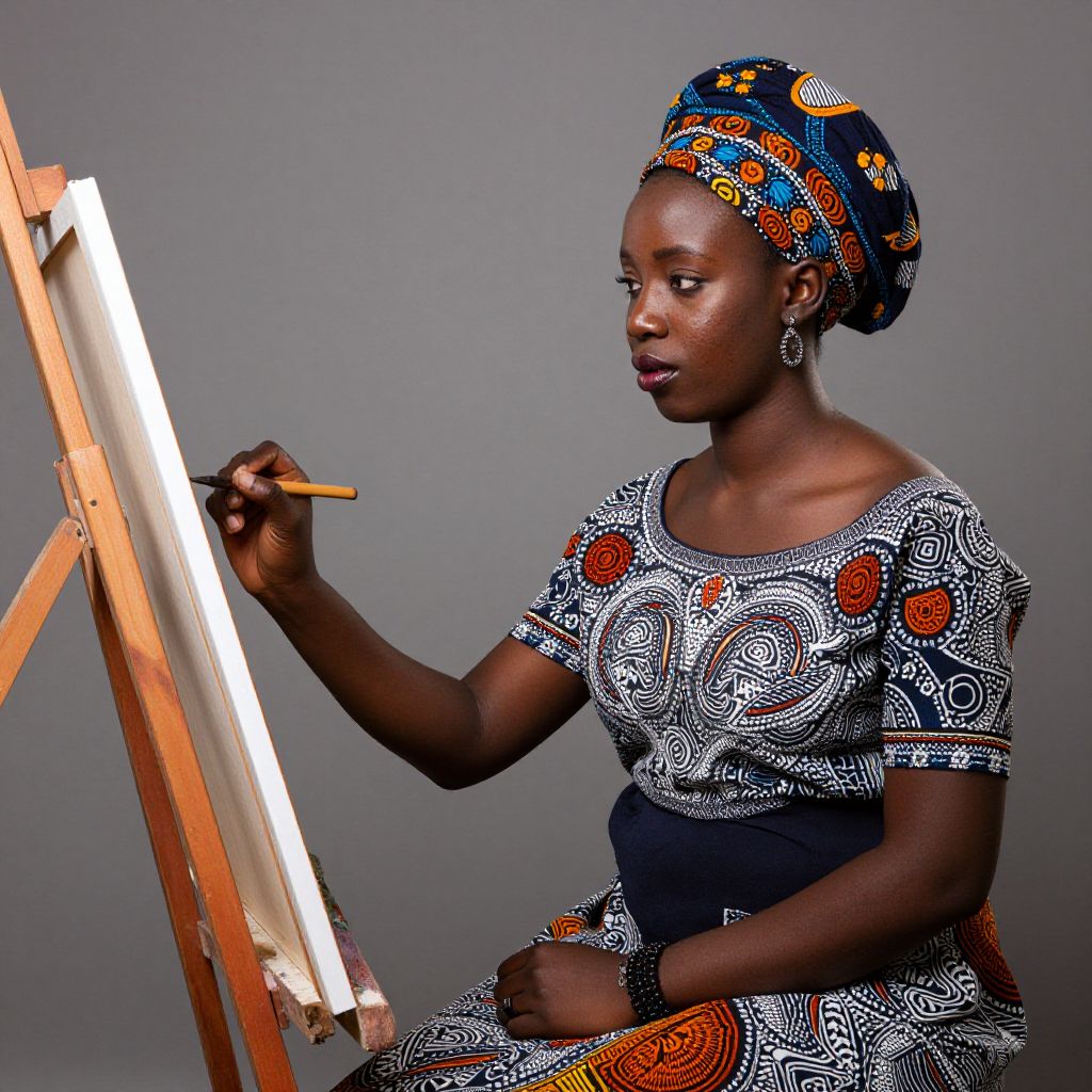 Photograph of a dark-skinned African woman with a slender build, wearing an intricately patterned dress with white, black, and red abstract designs, and a matching headwrap with colorful patterns. She sits beside a wooden easel, holding a yellow pencil, poised to paint. Her expression is focused, and she wears large, circular earrings. The background is a plain gray, highlighting her vibrant attire and the wooden easel. The lighting is even, emphasizing the textures and colors of her dress and headwrap.