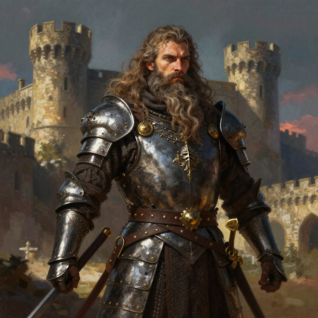 Barbas largas en un guerrero medieval, mostrando armadura con detalles, barba larga y enredada, pose imponente, fondo de castillo antiguo con nubes dramáticas, estilo pintura digital épica, colores oscuros y intensos.