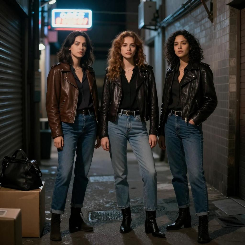 A hyperrealistic 6K cinematic portrait of three confident avant-garde street dancers standing in a rain-soaked urban alley. They wear executive black suits with white shirts and black high heels, framed by flickering neon signs and atmospheric fog. The scene features dramatic neon rim lighting, reflective wet pavement, and futuristic corporate aesthetics with crisp, precise edges and microfilm grain texture.