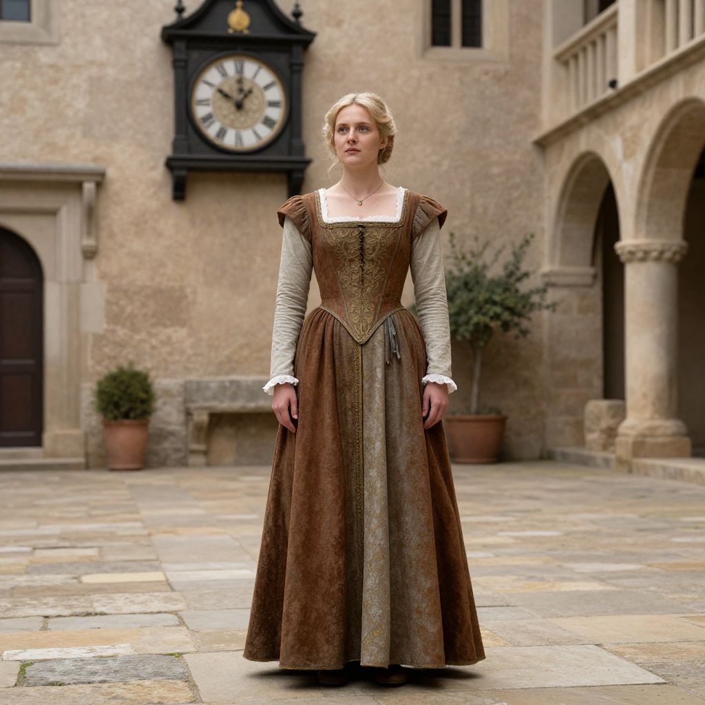 Photograph of a fair-skinned blonde woman with a serious expression, standing in a stone courtyard. She wears a 16th-century-style dress with a brown velvet bodice, white long-sleeve blouse, and brown skirt, featuring intricate embroidery. The background includes a large, black, ornate clock with white Roman numerals mounted on a beige stone wall, and potted plants. The courtyard has a tiled floor and arched doorways. The scene exudes a historical, medieval European vibe. The woman's hair is styled in a low bun, and her attire is period-accurate, suggesting a historical drama or period piece setting.
