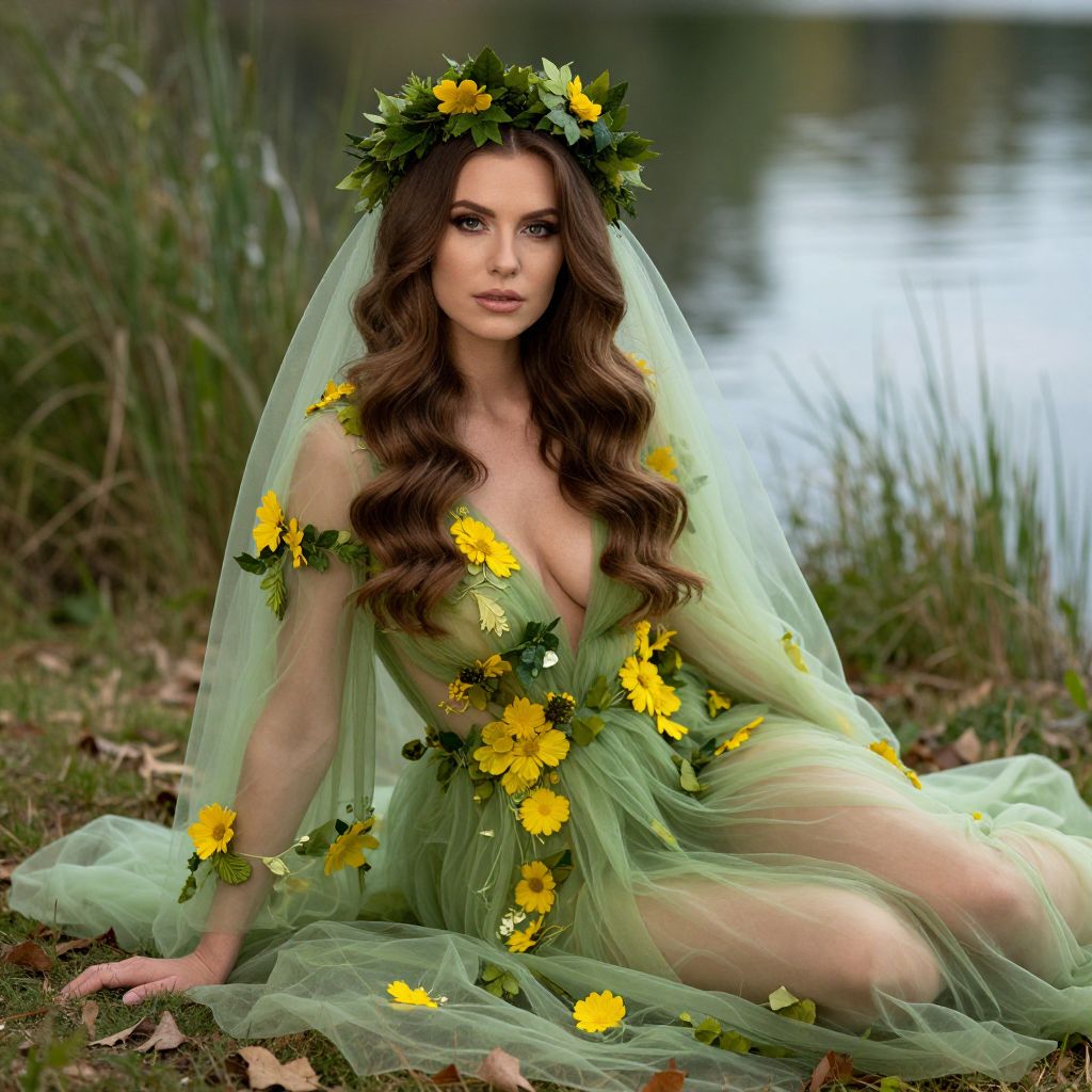 Photograph of a fair-skinned woman with long, wavy brown hair, sitting by a calm lake. She's wearing a sheer, green dress adorned with yellow flowers and leaves, and a leafy crown with a matching veil. Her dress reveals a cleavage, and she's surrounded by tall grasses and fallen leaves. The soft, natural light creates a magical, ethereal vibe.