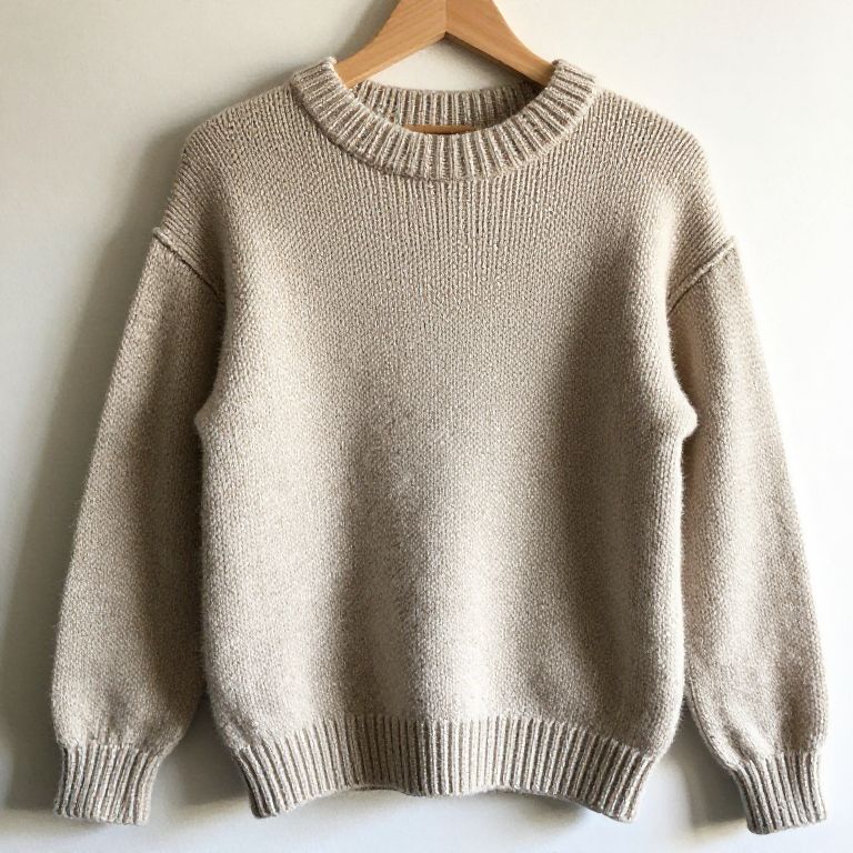Photograph of a beige, long-sleeved, knitted sweater hanging on a wooden hanger against a white wall. The sweater features a ribbed crew neck and cuffs, with a slightly loose, relaxed fit. The texture of the knit is visible, with a soft and slightly fuzzy appearance. The lighting highlights the sweater's neutral color and subtle shading, emphasizing its cozy, warm texture. The background is plain, keeping the focus on the sweater.