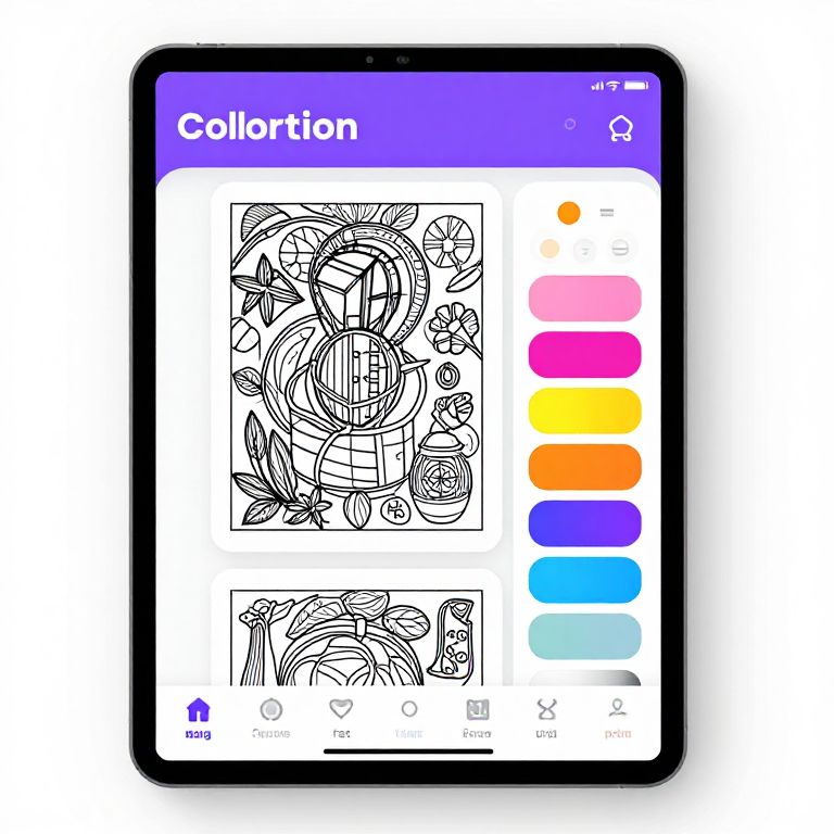 Coloring book creator app interface, vibrant and clean design, showing digital coloring pages with brushes, palettes, and layer options, user-friendly layout, bright colors, modern UI, creative tools, realistic tablet device environment, high resolution