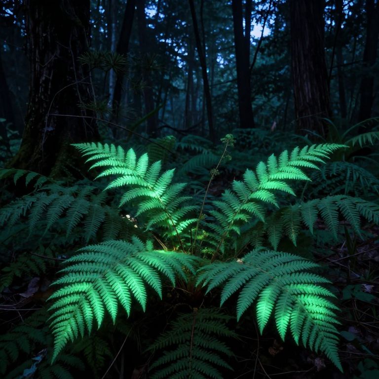 In the enigmatic embrace of a twilight forest, vibrant ferns pulse with ethereal luminescence, weaving a symphony of light and shadow that echoes the unseen rhythms of nature’s nocturnal dance, inviting introspection into the interconnected web of life and the quiet mysteries of the night.