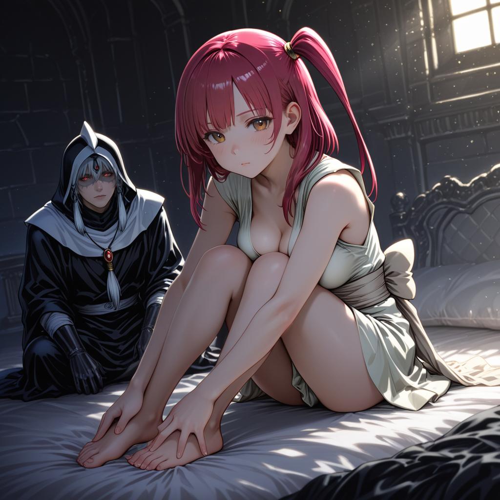 Digital anime-style artwork featuring Morgiana from Magi: The Labyrinth of Magic. Morgiana has long red hair tied on one side, red eyes, medium breasts, and is barefoot, sitting on a bed in a dimly lit room. Behind her, a mysterious hooded figure with glowing red eyes and a black and white robe is seated. The background shows a stone wall and a window with soft light filtering through.