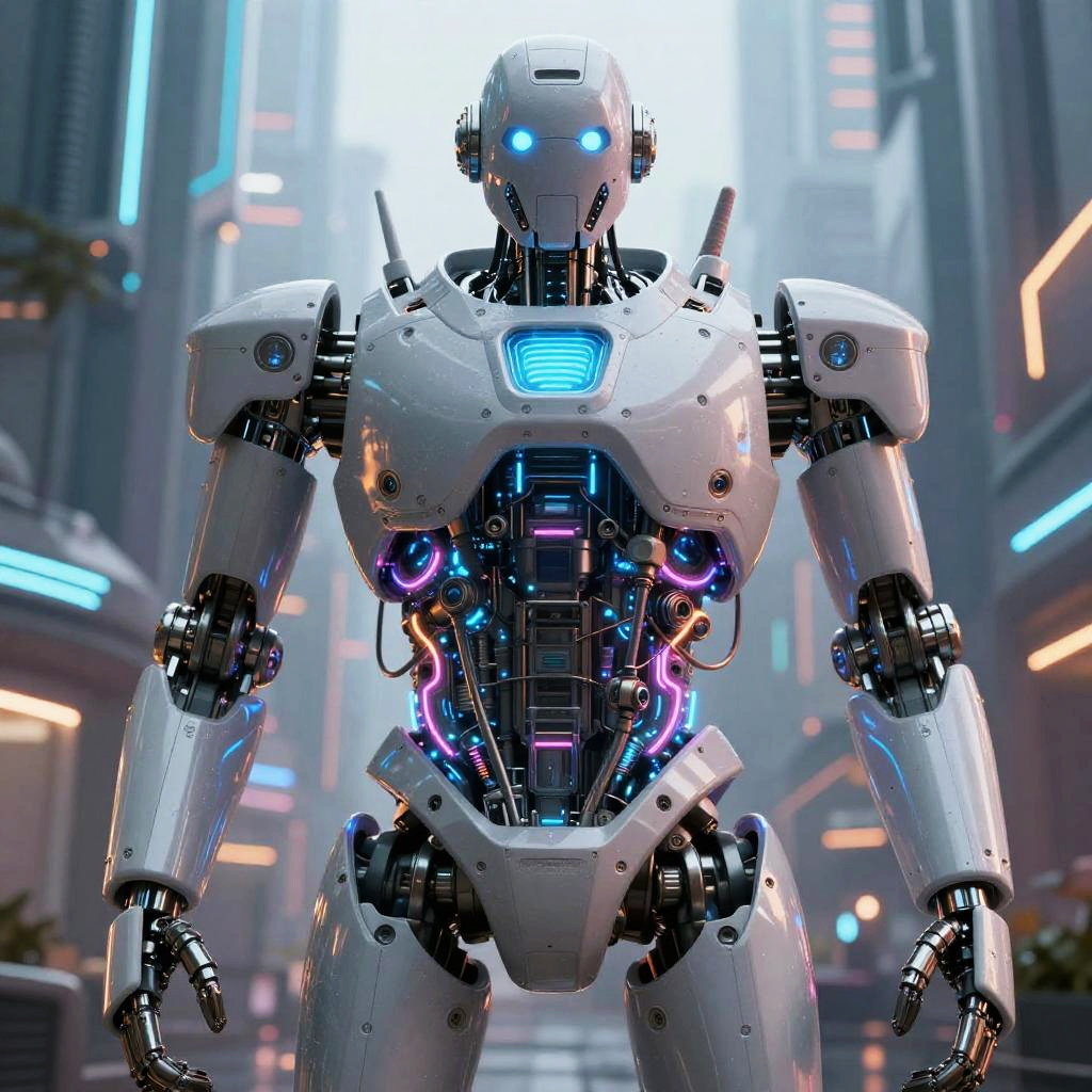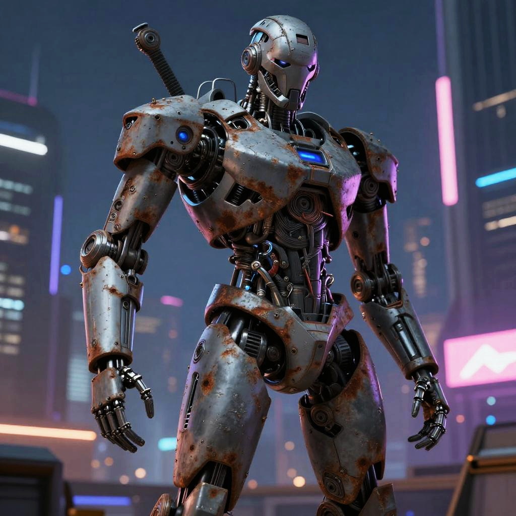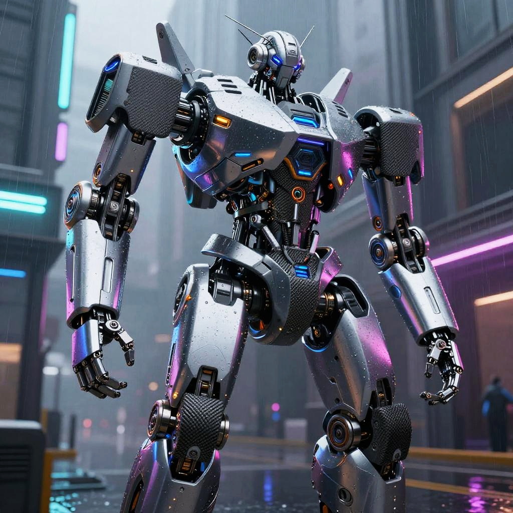 Robot polyarticulé advanced engineering, intricate mechanical joints, chrome and carbon fiber textures, urban cyberpunk setting with neon lights and rain reflections