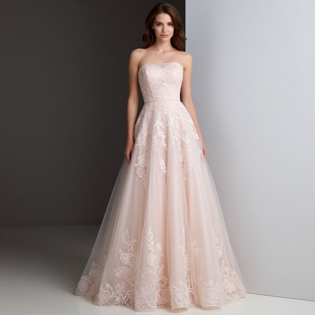 Elegant woman showcasing a custom-made, strapless prom dress in soft pink, featuring intricate floral lace detailing and a flowing tulle skirt, captured against contrasting backgrounds to highlight its timeless beauty.