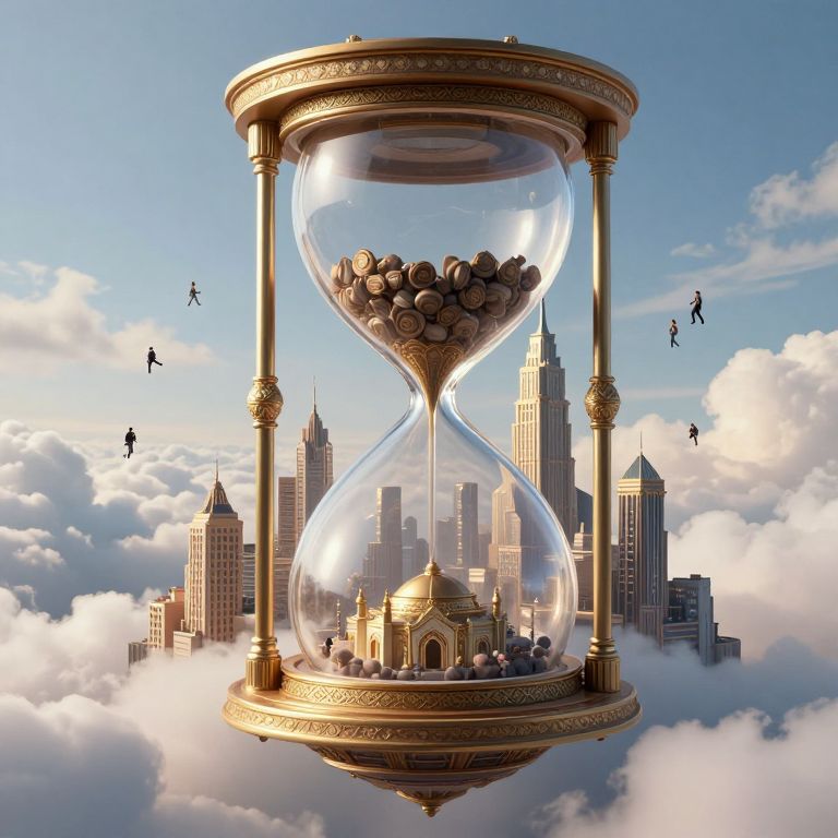 Digital artwork depicting a giant hourglass with ornate golden pillars, floating in a cloudy sky. The upper glass bulb contains numerous small, round, bronze-colored objects, while the lower bulb houses a miniature golden city with detailed architecture. Surrounding the hourglass are tall, modern skyscrapers, partially obscured by clouds. Small black silhouettes of people are scattered in the sky, appearing to fly or float. The background features a bright blue sky with fluffy white clouds. The overall style is surreal, blending elements of fantasy and realism.