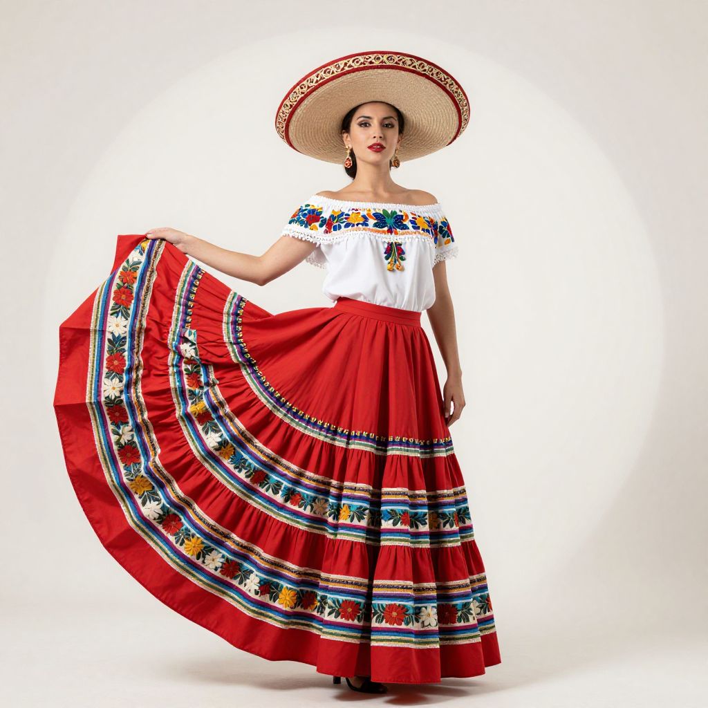 Elegant woman wearing a vibrant traditional Mexican dress, featuring a wide-brimmed sombrero, a white off-the-shoulder blouse with intricate embroidery, and a flowing red skirt adorned with colorful horizontal stripes and floral patterns, standing gracefully against a soft, circular background.