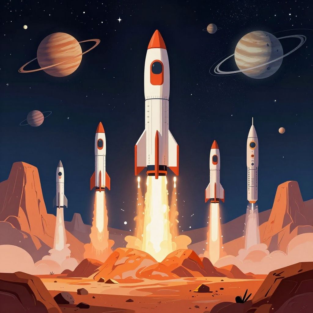Illustration of multiple retro-futuristic rockets launching from an orange rocky alien landscape with distant mountains. The scene is set under a starry sky filled with various planets and moons, showcasing orbits and celestial bodies in a vibrant sci-fi style.