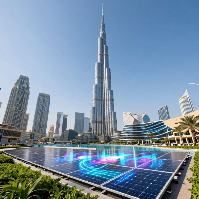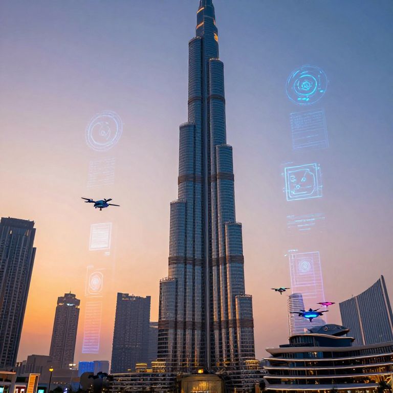 Burj Khalifa AI prompt: A futuristic AI-generated visualization of the Burj Khalifa at sunset, with smart glass buildings, autonomous drones, and digital holographic city interfaces overlaying the skyline, rendered in cinematic hyperrealism with neon lighting and cyberpunk atmosphere.