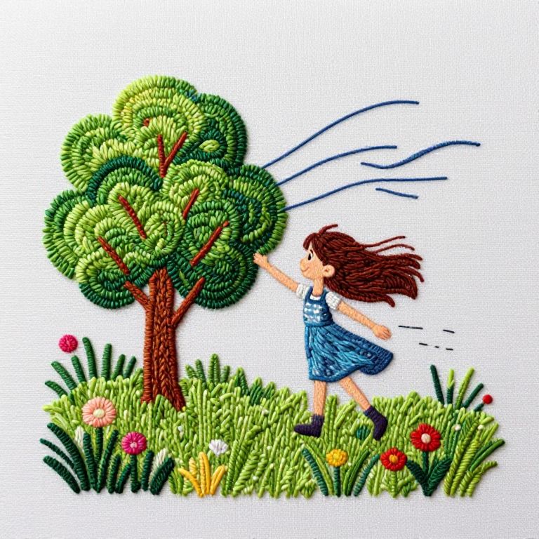 Embroidery Stitch Dictionary pixar style wind that blows in the nature touching trees, grass, flowers make it a little visible,