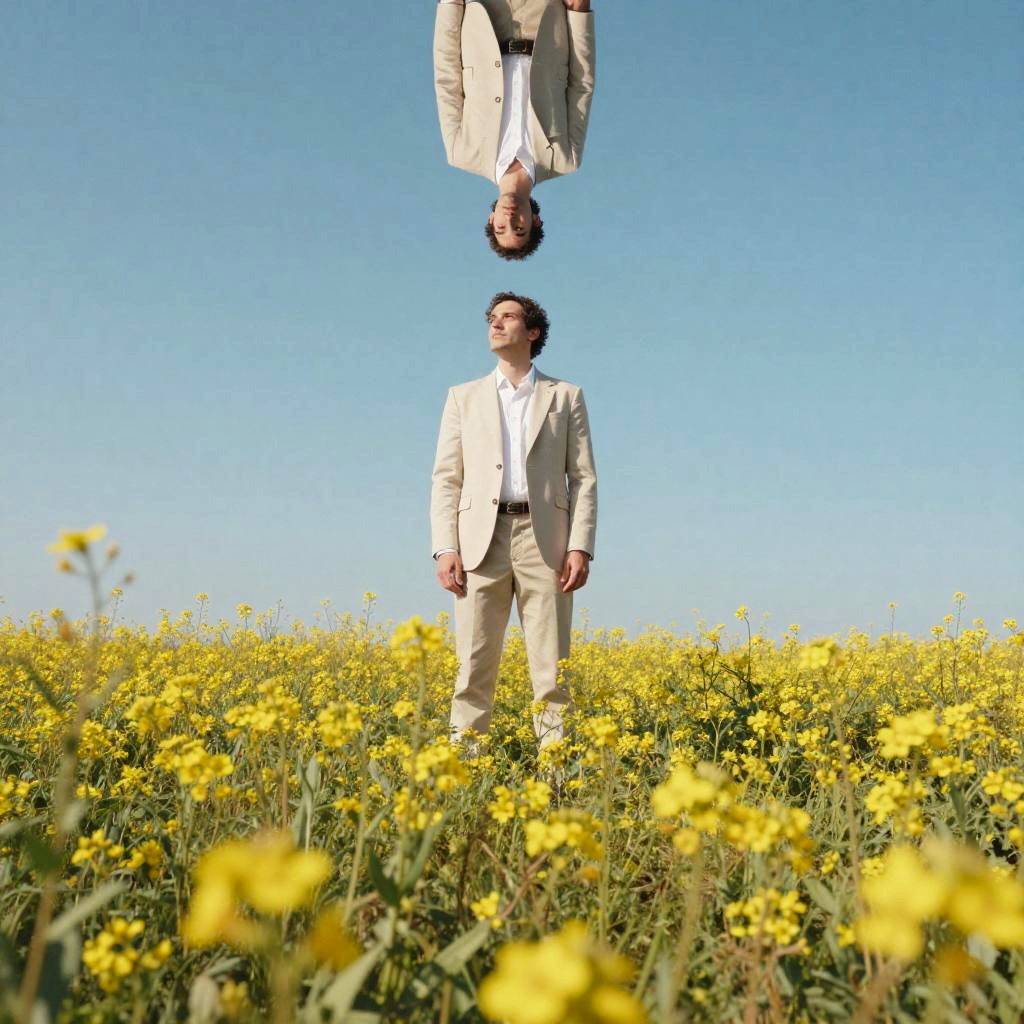 Photograph of a man standing in a sunlit field of yellow wildflowers, taken from a low angle. He's wearing a light beige suit with a white shirt, and his reflection is mirrored in the clear blue sky above. The background shows a bright, cloudless sky, and the flowers are in sharp focus in the foreground. The image has a surreal, dreamy quality.