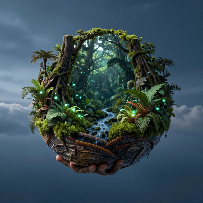 Suspended between earth and sky, a delicate clam cradles a microcosm of serenity—a thriving rainforest where streams whisper secrets, moss hums with life, and bioluminescent whispers dance in the twilight, embodying the fragile beauty of nature’s eternal promise.