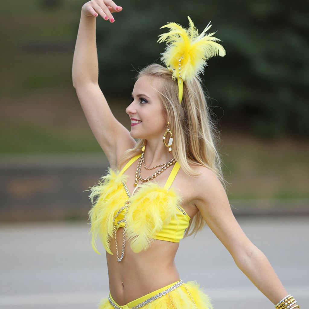 Yellow feather dance costume, 1girl, jewelry, blonde hair, solo, solo focus, outdoors, bracelet