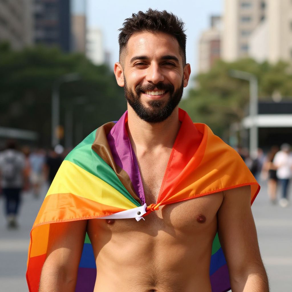 Photograph of a smiling, bearded man with short, dark hair, standing in an urban outdoor setting. He's shirtless, wearing a vibrant rainbow Pride flag draped over his shoulders. The background shows blurred city buildings, trees, and people. Sunlight casts a bright, natural glow, highlighting the flag's colors against his tanned skin. His confident, joyful expression exudes pride and positivity.