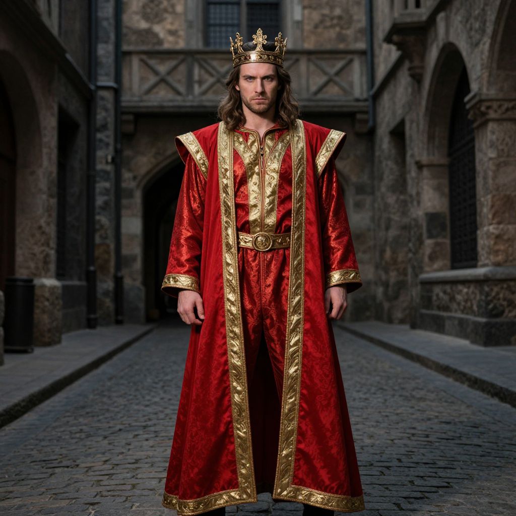 A man wearing a red and gold robe with a crown on his head, standing on a cobblestone street with a building in the background. The man has a strong, confident posture, with intense eyes that reflect authority and power. The scene is set in a medieval-inspired city, with the red and gold colors creating a striking contrast against the stone buildings and the dark streets. The atmosphere is dramatic and mysterious, with a sense of grandeur and historical significance.