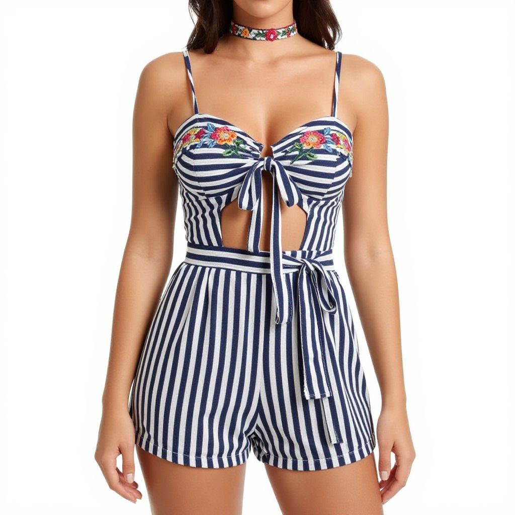 "Woman, casual summer style, navy and white vertical striped romper, sweetheart neckline, thin adjustable spaghetti straps, front tie cutout at the waist, decorative multicolored embroidered floral accents, high-waisted shorts, cinched with a matching fabric belt, choker necklace, plain white background.. Sexy. Pretty face and beаutiful eyes. Big breasts."