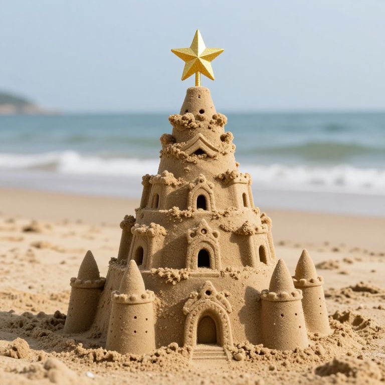 A whimsical sandcastle stands tall on the beach, its spires and turrets seamlessly transformed into the shape of a Christmas tree, crowned by a golden star, defying the ordinary boundaries between sand art and festive iconography.