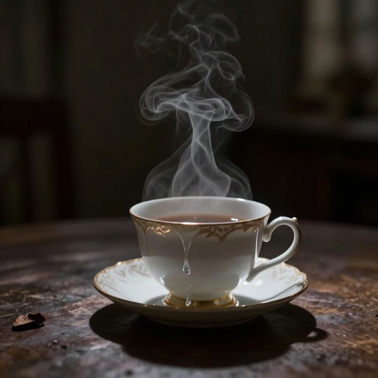 A melancholic teacup weeps steam in a quiet room where shadows whisper forgotten recipes from the future.