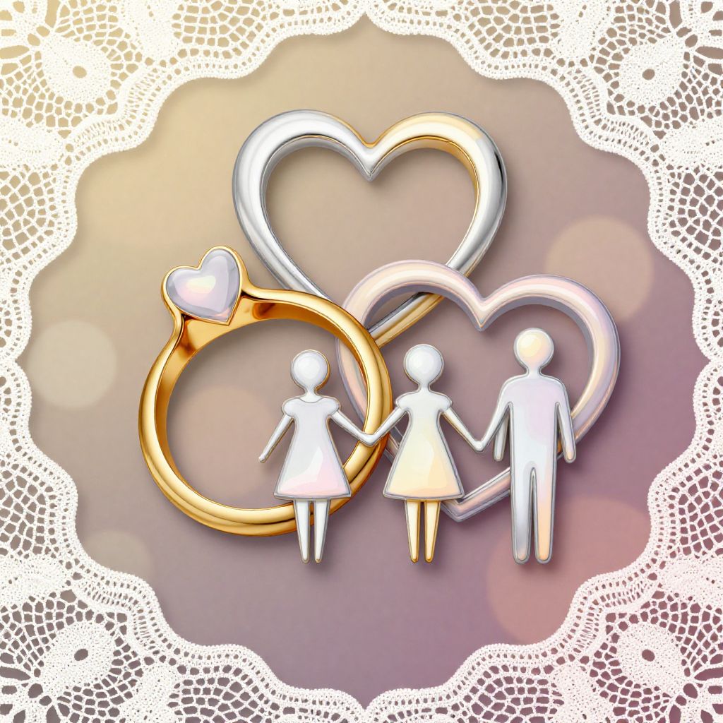 Unity family symbols combining elegant ring and heart shapes linked together, metallic gold and silver tones with soft pastel highlights, delicate lace patterns framing the composition, light bokeh effect in the background to emphasize warmth and unity.