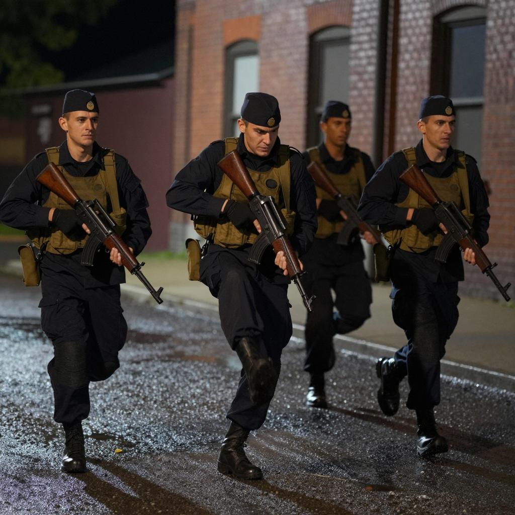 Photograph of two soldiers in a foggy, palm tree-filled area. Foreground soldier with green helmet, glasses, and green uniform, holding a rifle. Background soldier with green helmet, brown shirt, and rifle slung over shoulder. Both have serious expressions. Palm trees in background. Foreground soldier has a small white peace symbol on chest.