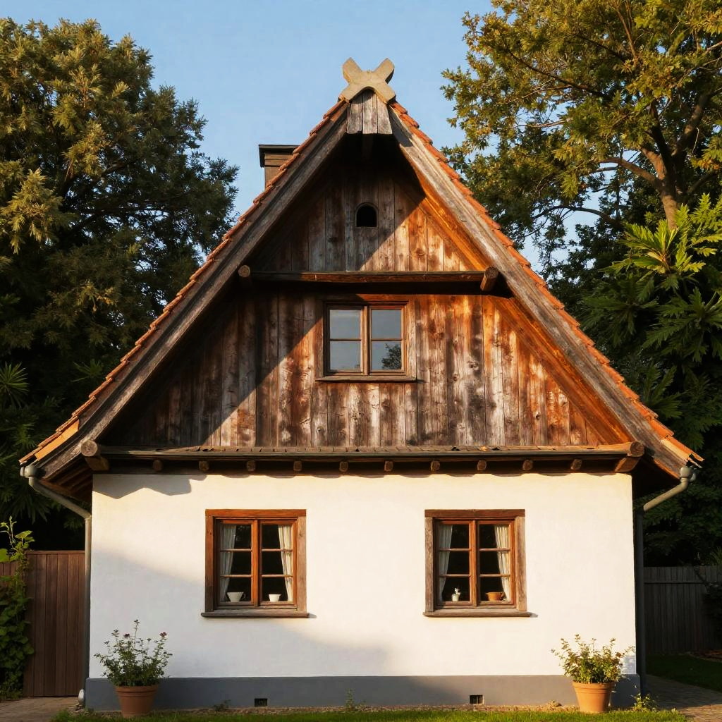 Walmdach architecture, a traditional hipped roof house surrounded by lush greenery, wooden beams, cozy windows, morning sunlight casting soft shadows, charming countryside atmosphere, detailed textures on roof tiles, warm inviting colors