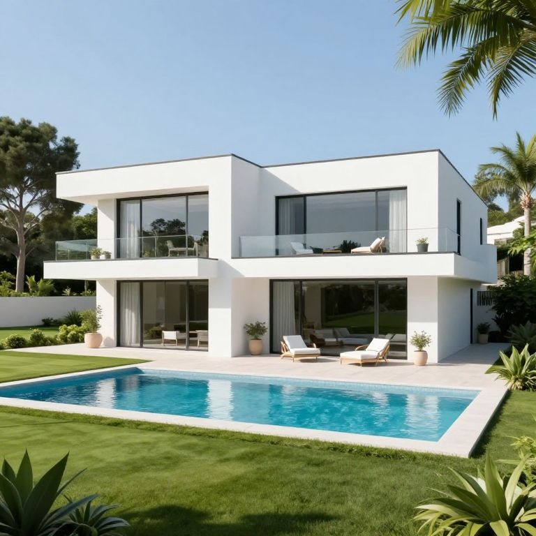 A sleek 3D-rendered depiction of brand new modern contemporary luxury villas, showcasing a pristine white exterior, expansive glass windows, and a serene pool area surrounded by lush greenery, embodying the high-definition aesthetic of a frontline golf property on the New Golden Mile between Marbella and Estepona.