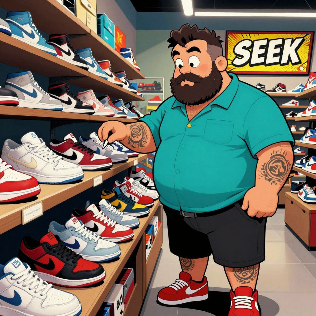 In this vibrant and detailed illustration, a man with a large build and a full beard is engrossed in sneaker shopping. He stands in front of a shoe display, his eyes wide with wonder as he gazes at the array of shoes. The man is dressed in a teal shirt, black shorts, and red sneakers, with tattoos visible on his arms and legs. The shoe display is filled with various sneakers, including white, red, and blue pairs, arranged neatly on shelves. The background features a sign with the word \"SEEK\" and a comic book-style font, adding to the comic book aesthetic of the scene. The overall composition is dynamic, with the man's body positioned in the foreground, creating a sense of depth and perspective. The interplay of colors, textures, and shapes creates a visually engaging and immersive experience.