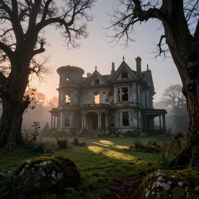In this evocative scene, reminiscent of surreal landscapes and photorealistic masterpieces, a majestic yet dilapidated Victorian estate rises from the fog-shrouded valley base, its turrets reaching into the thick mist. The viewpoint is low, surrounded by age-old, gnarled trees whose branches seem to communicate ancient tales as they entwine with the house's deteriorating exterior. As daylight transitions into twilight, a mystical radiance emanates from the mansion's broken windows, projecting elongated shadows that play across the lush grass and mossy boulders littering the overgrown garden. This captivating yet ominous landscape encourages viewers to contemplate time's inexorable march and to speculate on the myriad tales concealed within these decaying walls.