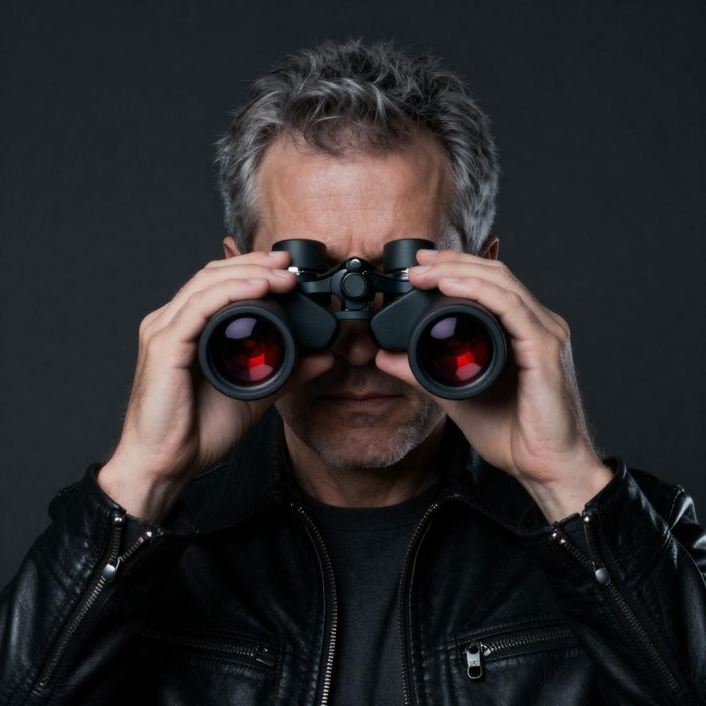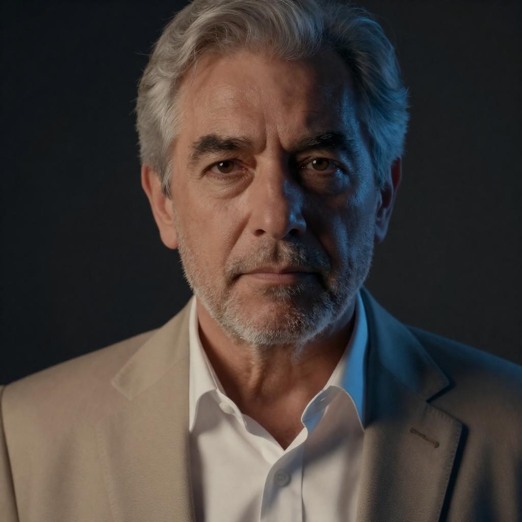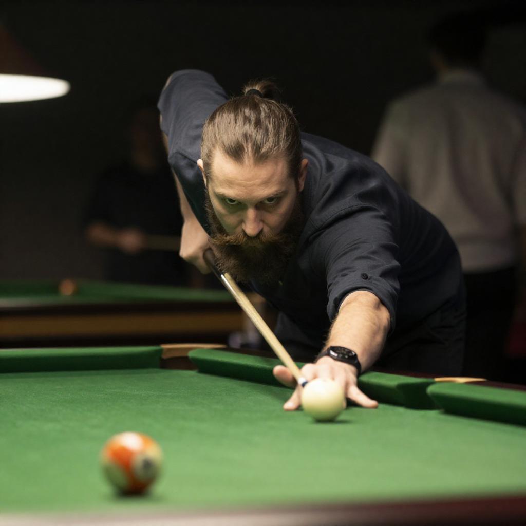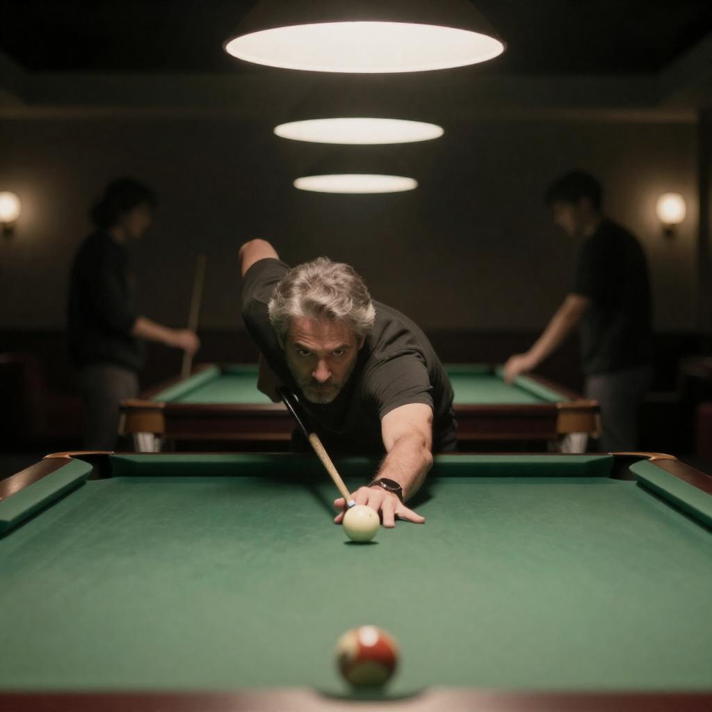 Photograph of a man with gray hair and mustache, leaning forward over a green pool table, aiming a cue stick at a white pool ball. Dimly lit room, two blurred people in background. Hanging lamps overhead. Pool balls and cue sticks scattered on table. Smoke in air.