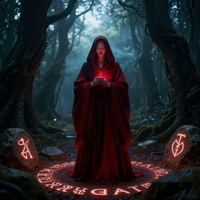 Photograph of a mysterious woman in a dark, forested setting. She has pale skin, dark eyes, and is wearing a long, flowing, deep red hooded robe that obscures her hair. She stands centered, holding a glowing red orb in her hands. The forest is dense with tall, twisted trees, and the ground is covered in mist. Two large stones with glowing runes flank her, and a circular, glowing red sigil is on the forest floor beneath her. The scene is illuminated by the eerie red light from the orb and runes, creating a mystical, otherworldly atmosphere.