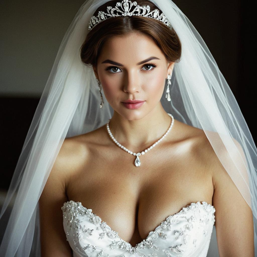 Beautiful wedding dress ,1girl, solo, dress, wedding dress, breasts, veil, cleavage, realistic, white dress, jewelry, bridal veil, brown hair, tiara, medium breasts, bride, looking at viewer, earrings, collarbone, lips