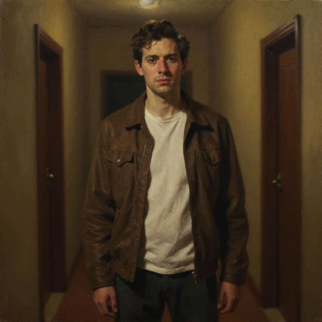 Portrait of a young adult man with curly dark hair, wearing a brown leather jacket over a white t-shirt, standing in a narrow, dimly lit hallway with wooden doors on both sides. The setting appears to be indoors with warm lighting.
