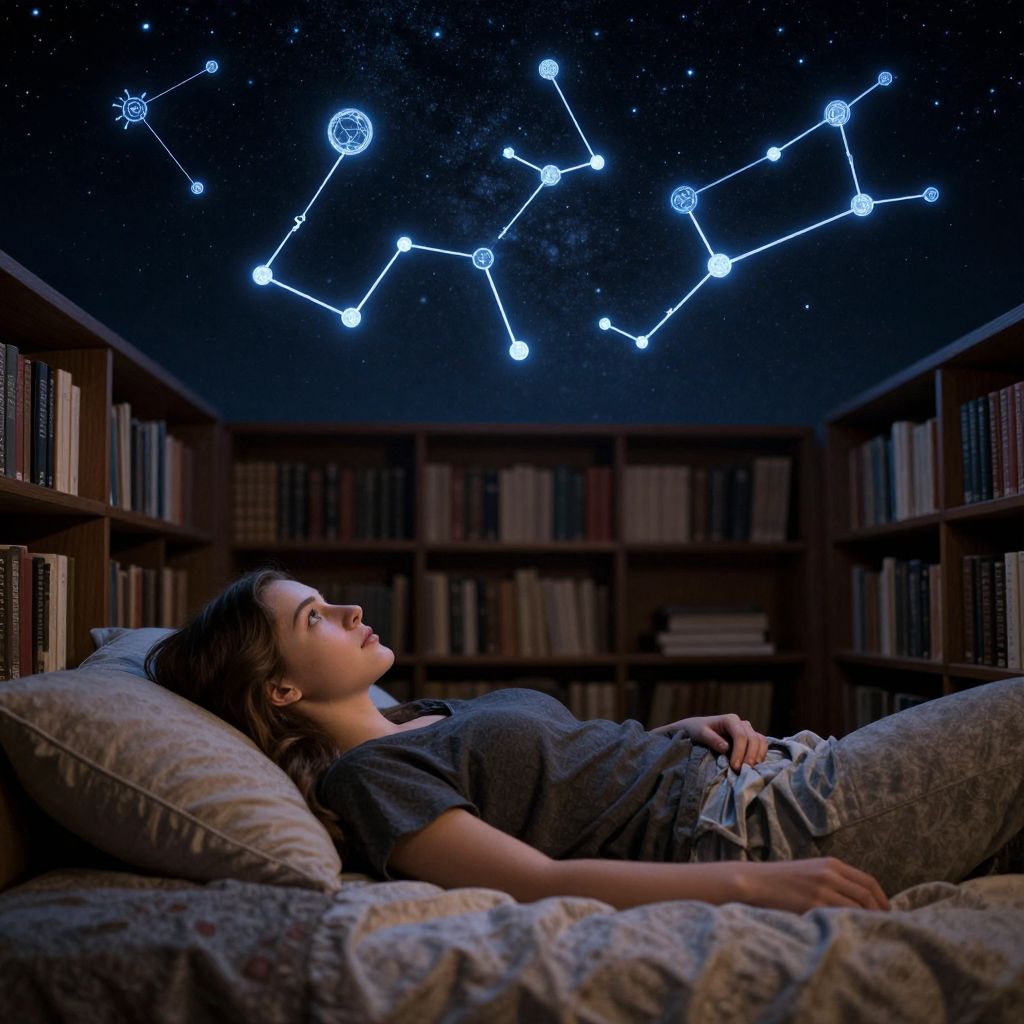 A young woman lies in a cozy bed beneath a starlit ceiling, her gaze fixed on constellations that seem to float above her, as if the night sky has become an extension of her personal library.