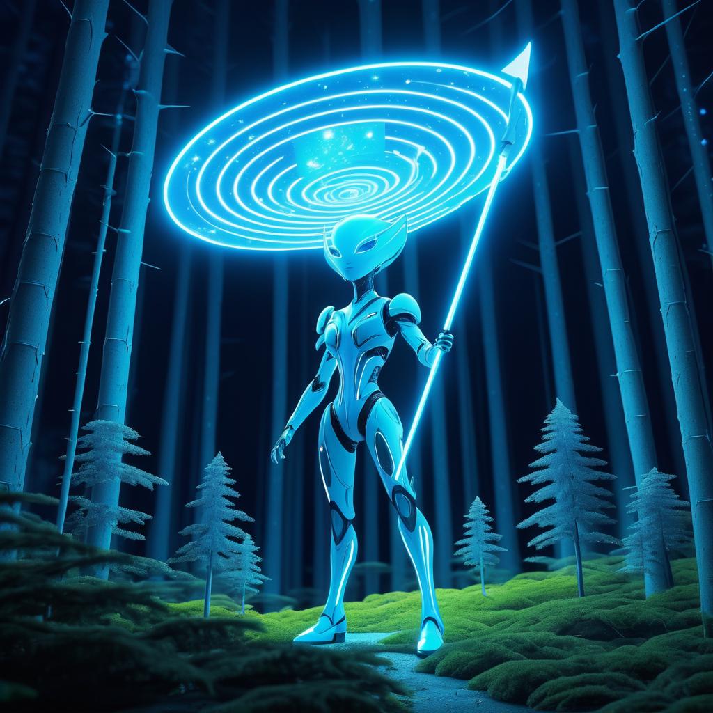 A high-quality 3D render of a transforming alien figure standing in a futuristic, bioluminescent forest clearing. The alien appears humanoid with smooth, flowing features and is holding a large glowing circular object or flag above its head. The surrounding forest features tall trees and soft, mossy ground illuminated by ethereal blue light, giving a mystical and psychological atmosphere.