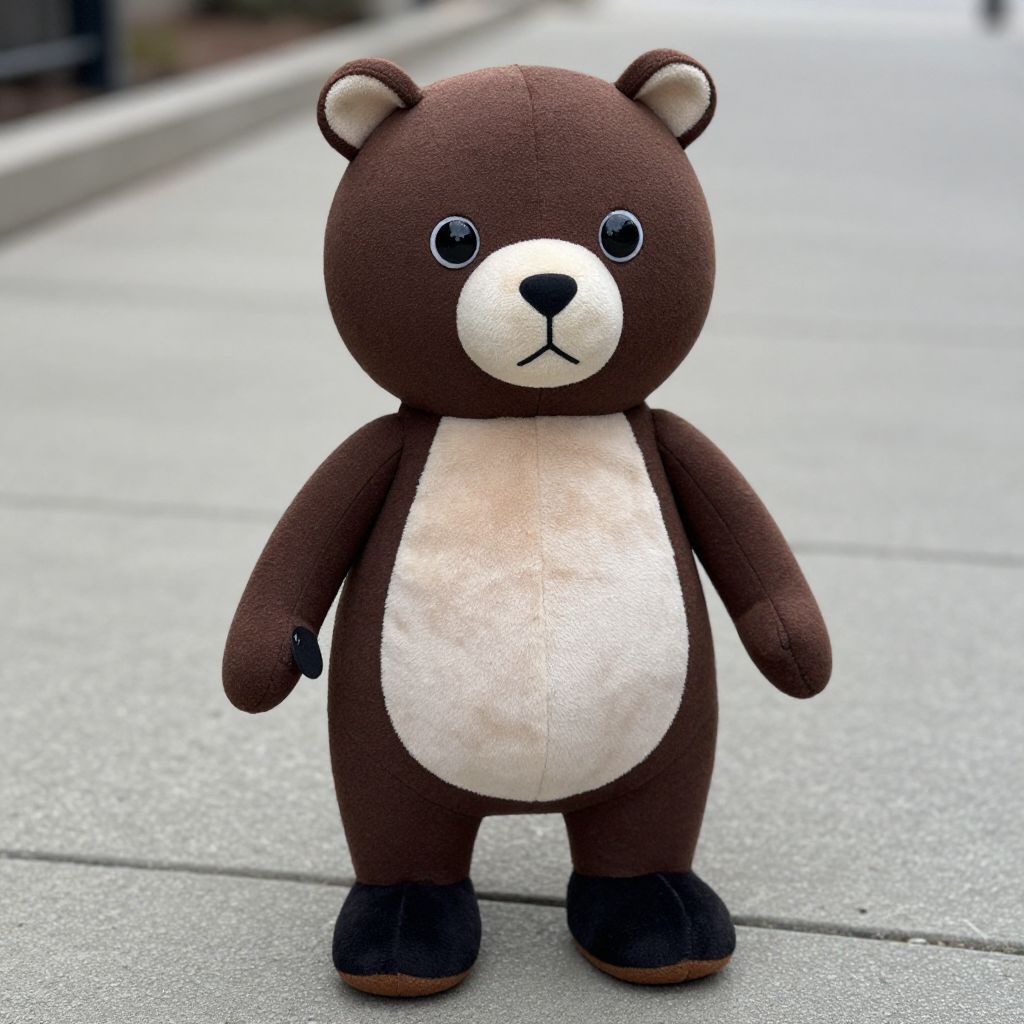 Photograph of a brown and white plush teddy bear with black eyes, black nose, and black feet, standing on a concrete sidewalk.