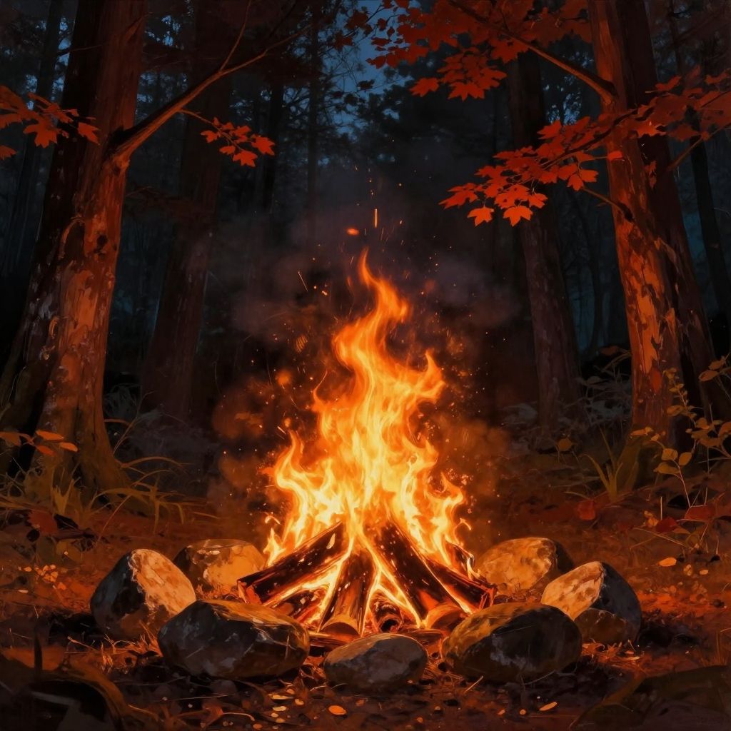 Digital painting of a glowing campfire surrounded by stones in a dark forest. The forest is illuminated with intense flames and vivid fire textures, creating a dramatic and atmospheric scene. Tall trees with branches and red-orange leaves stand against a smoky night background.
