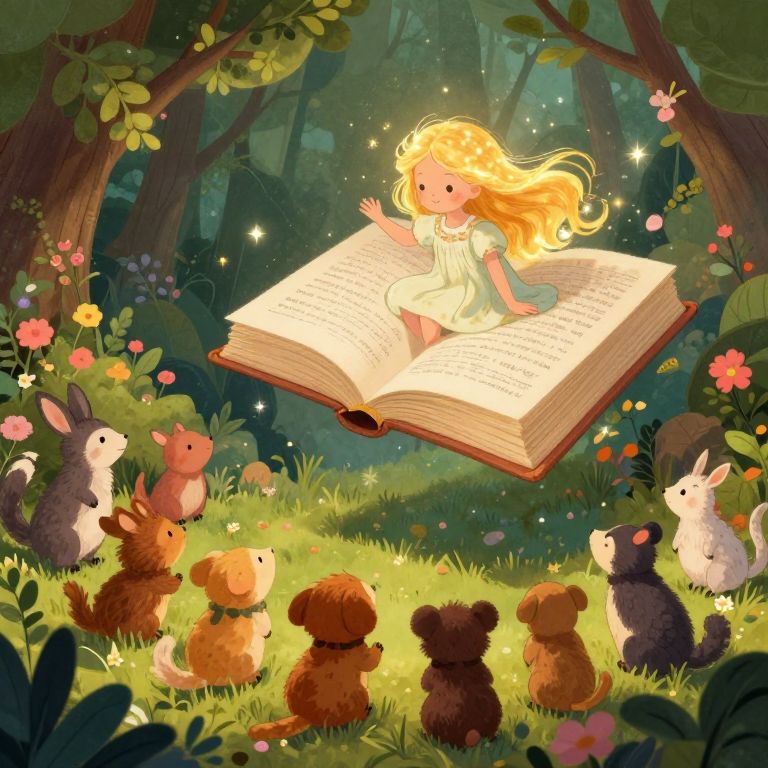 Craft an enchanting illustration with whimsical flair, capturing a young girl with shimmering golden locks and a celestial aura, seated atop a colossal floating tome as she narrates to an exuberant assembly of playful woodland creatures. The scene should radiate a sense of magic and fascination, with abundant verdant foliage and brilliant blossoms creating a spellbinding setting for the heartwarming tale. Observe from above as these unlikely companions forge bonds through storytelling, their shared escapade unfolding in the loving arms of nature's embrace.
