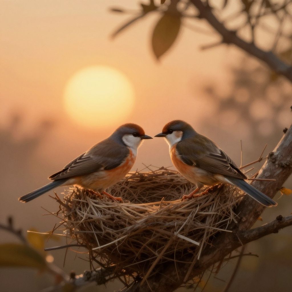 A symbol of trust, two birds building a nest together, sunrise light, impressionist style, nature-inspired earthy palette